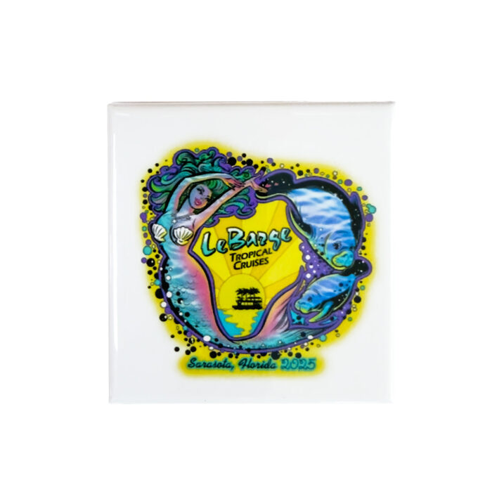 Bring a little piece of your LeBarge Tropical Cruises adventure into your home with these charming magnets. The collection includes a 2 1/4-inch circle magnet featuring the classic LeBarge Tropical Cruises logo and a 3-inch square magnet showcasing playful mermaid and manatee artwork inspired by Sarasota Bay.