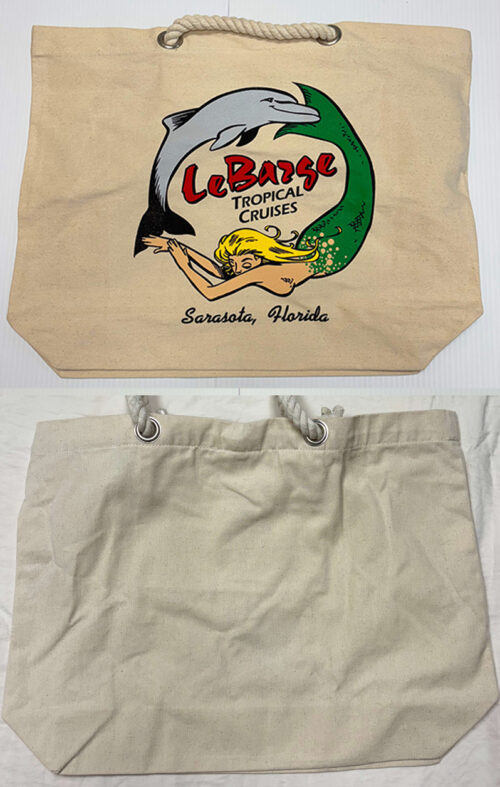 Carry a piece of your LeBarge Tropical Cruises adventure wherever you go with this classic cream-colored tote bag. Made from 100% cotton, it features sturdy rope straps and a secure metal snap closure for practicality and durability. The front showcases the LeBarge Tropical Cruises logo celebrating the fun, sun, and memories of your time on Sarasota Bay.