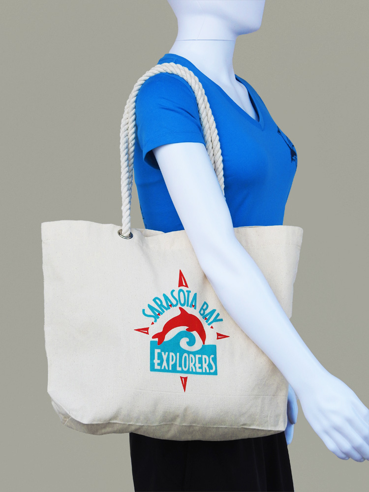 Carry a piece of your Sarasota Bay Explorers adventure wherever you go with this classic cream-colored tote bag. Made from 100% cotton, it features sturdy rope straps and a secure metal snap closure for practicality and durability. The front showcases the Sarasota Bay Explorers logo celebrating the fun, sun, and memories of your time on Sarasota Bay.